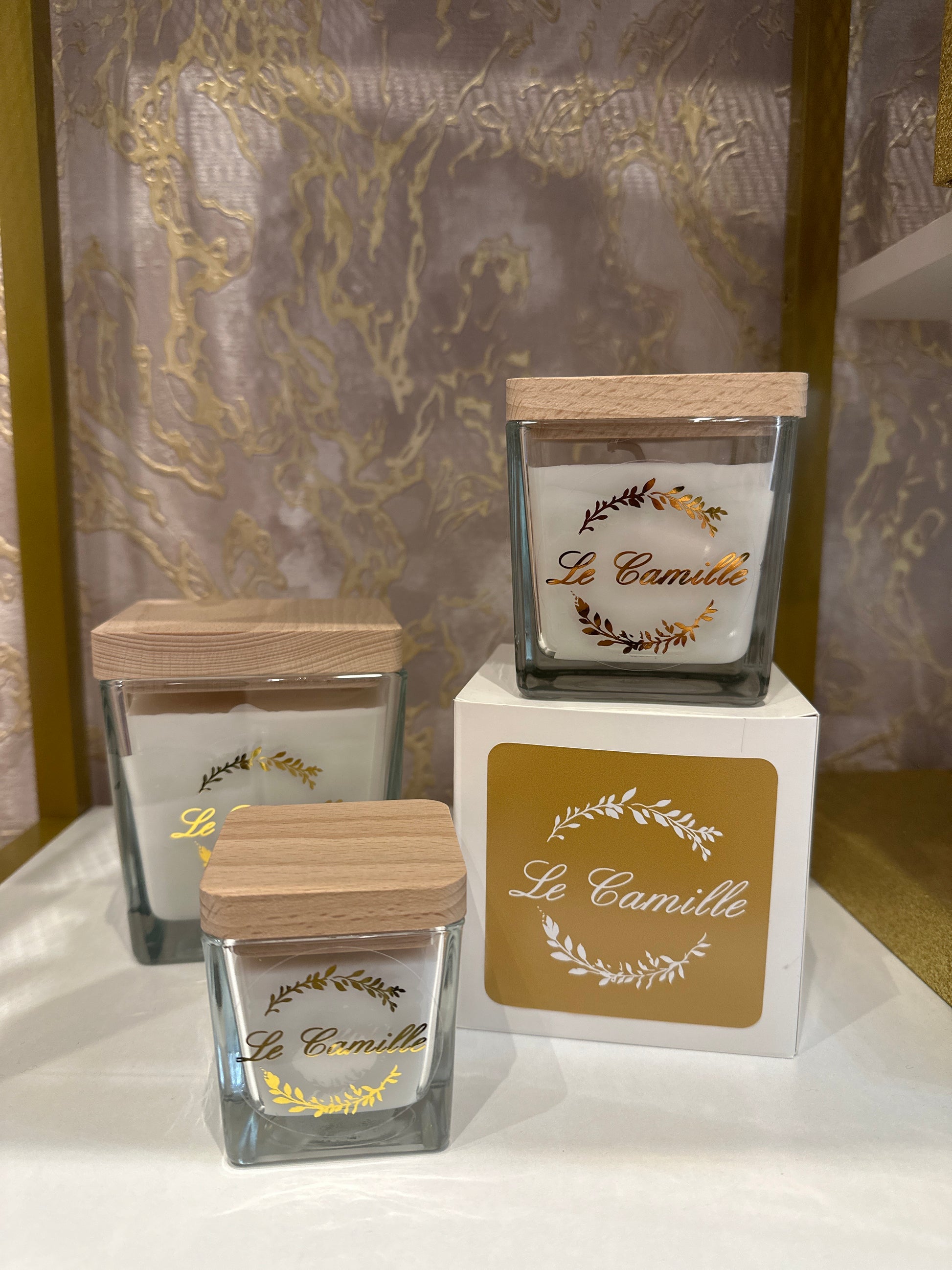 Candela profumata con tappo in legno. Personalizzato e ideato da Le Camille. Disponibile in 3 fragranze diverse tra loro e in e formati.