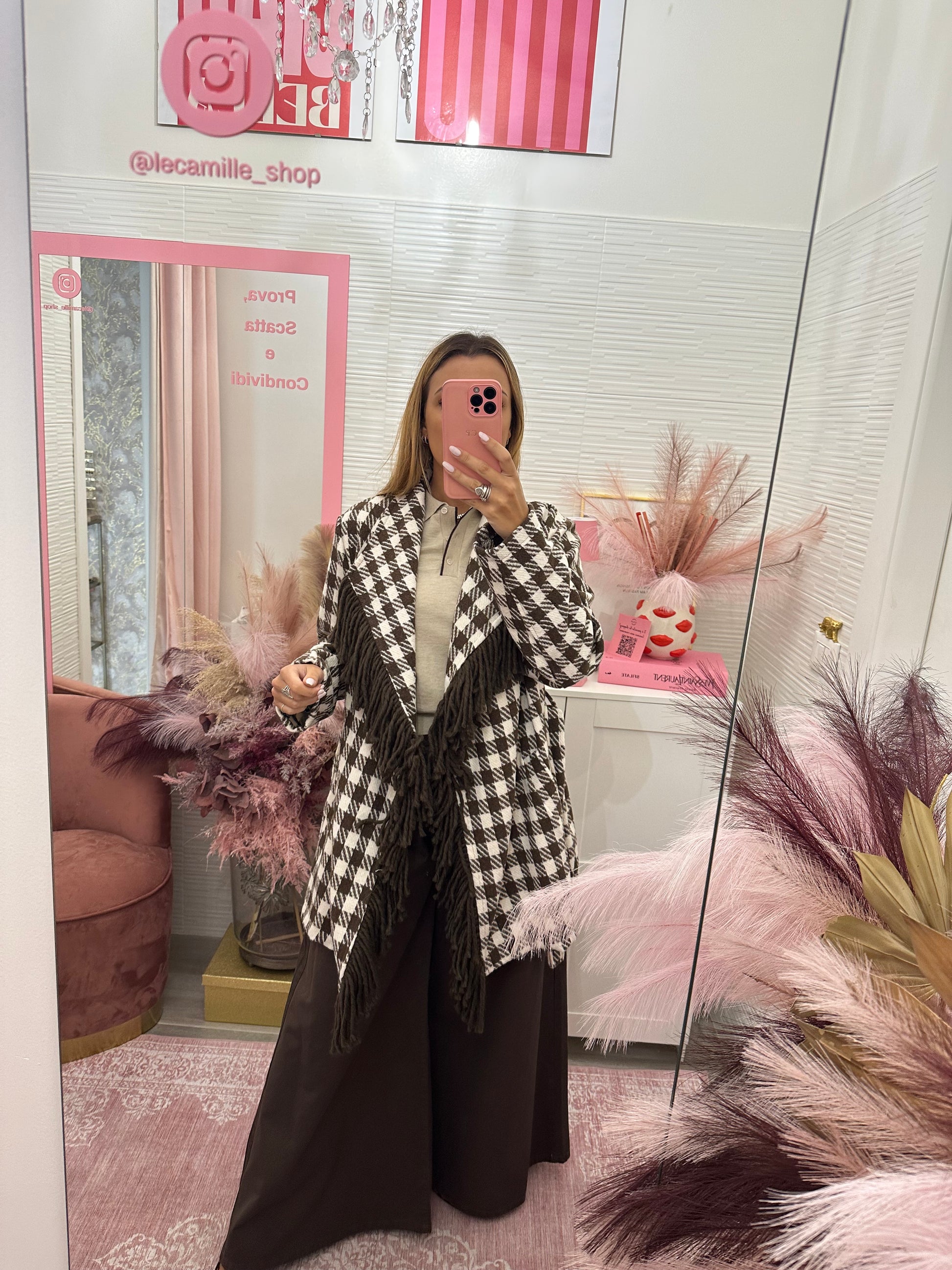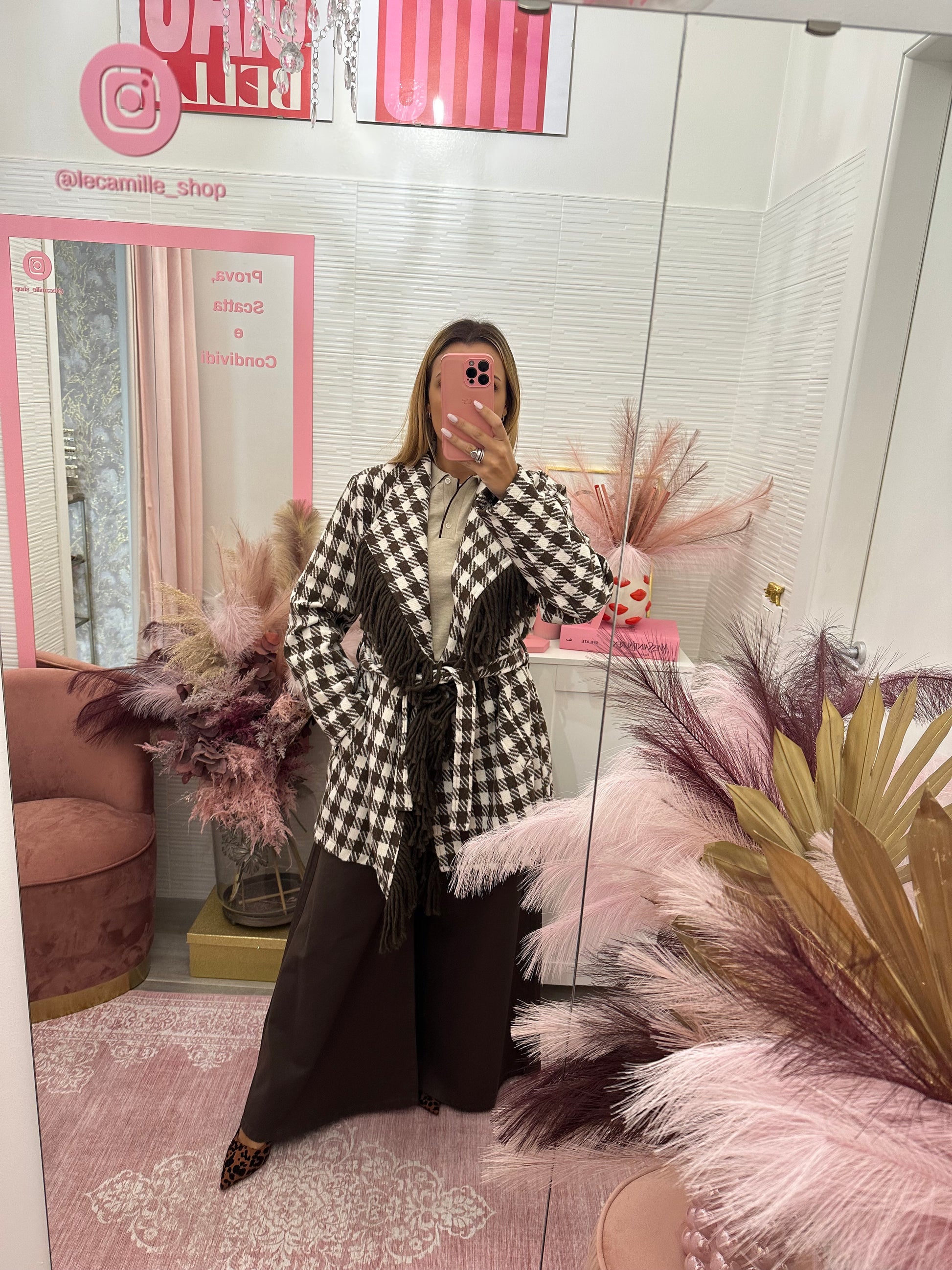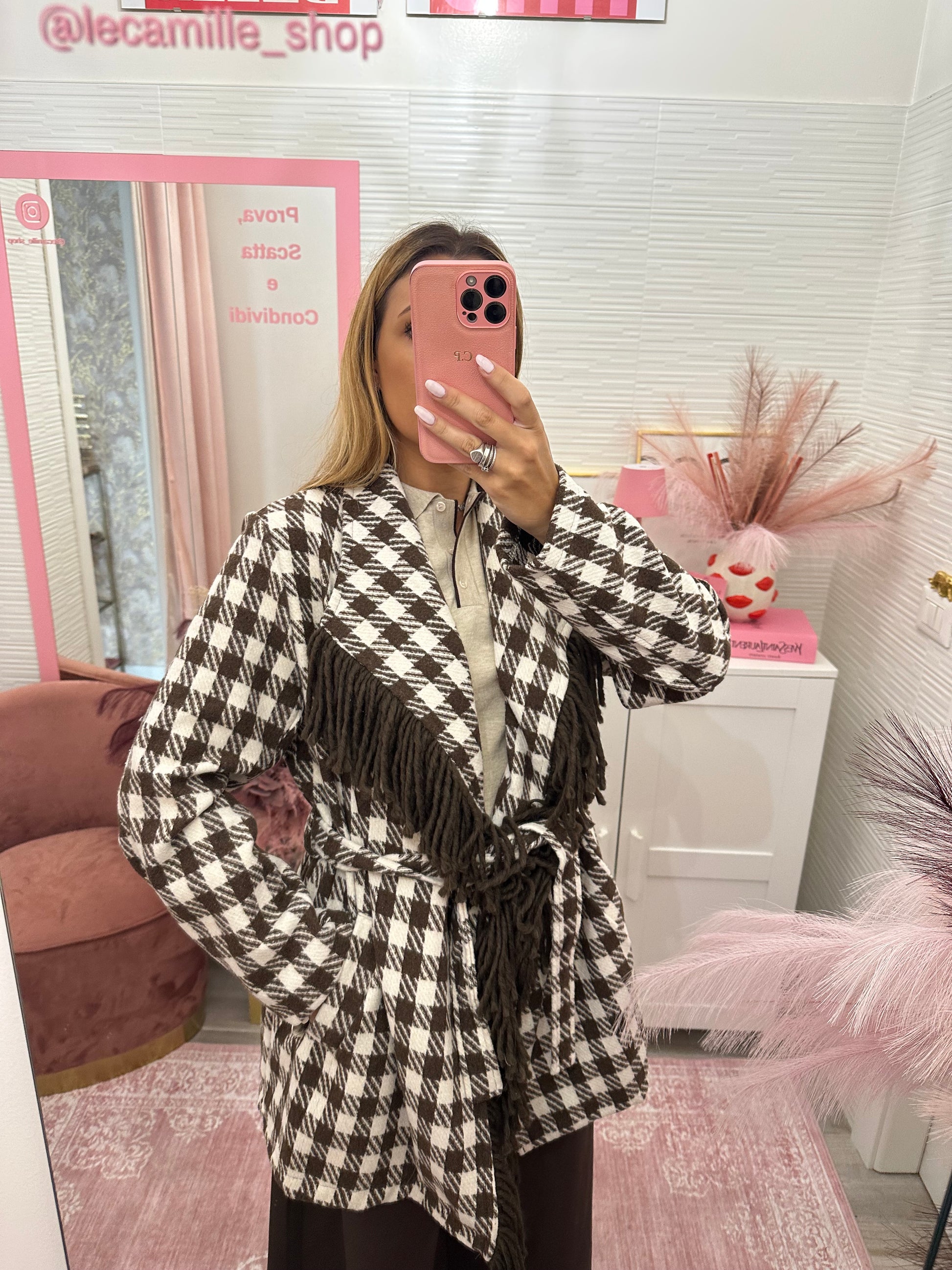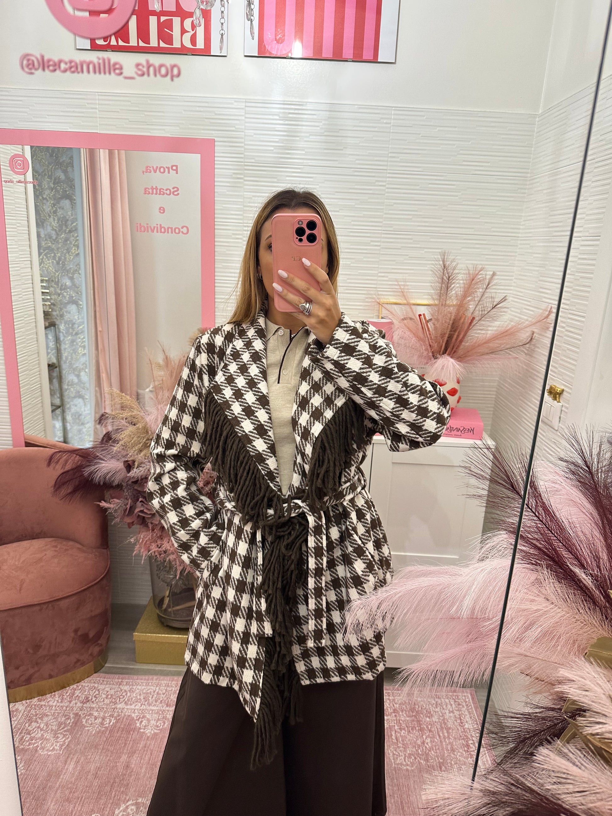 Cappottino leggero, con cintura in vita e frange. Tasche laterali.