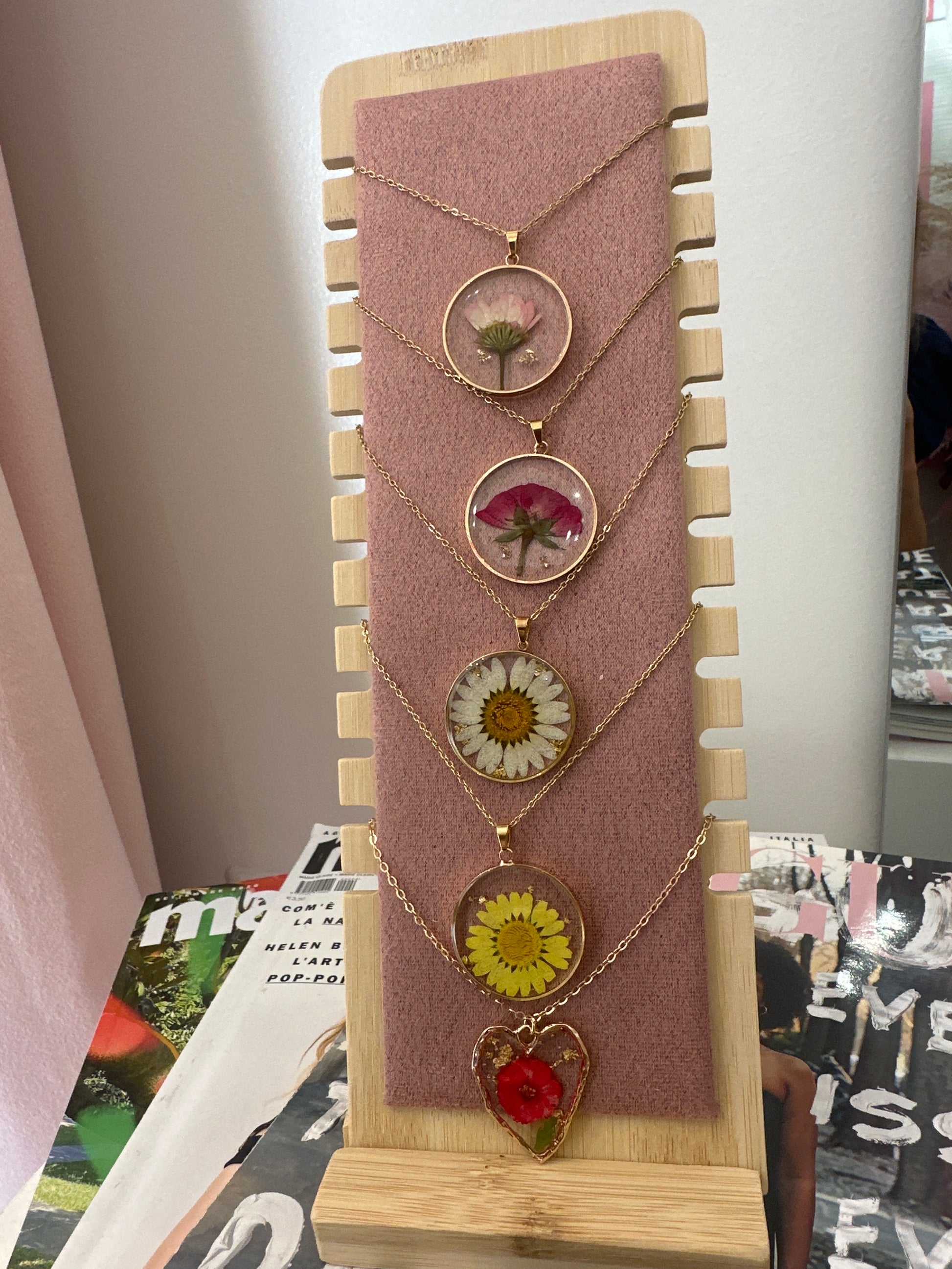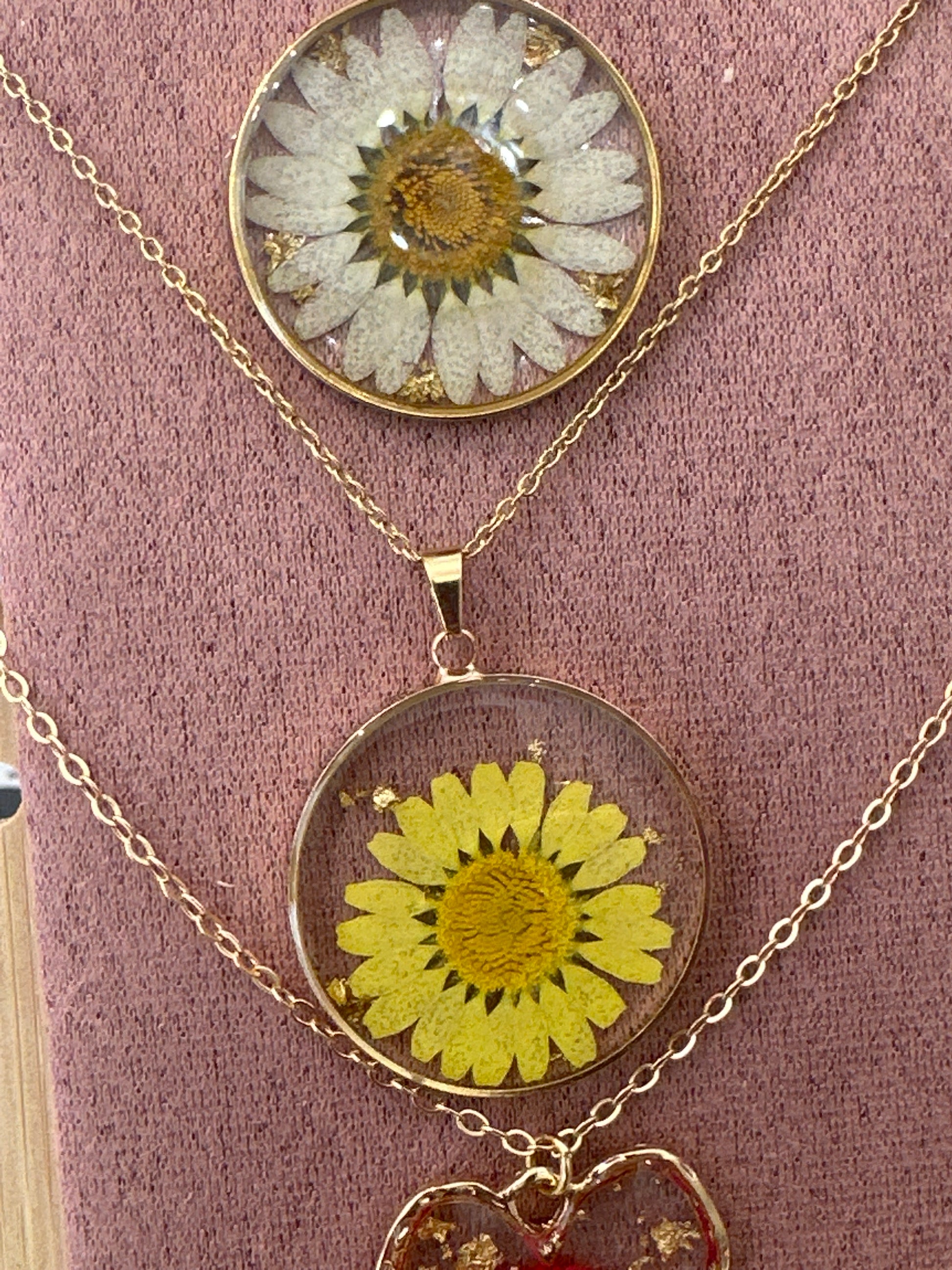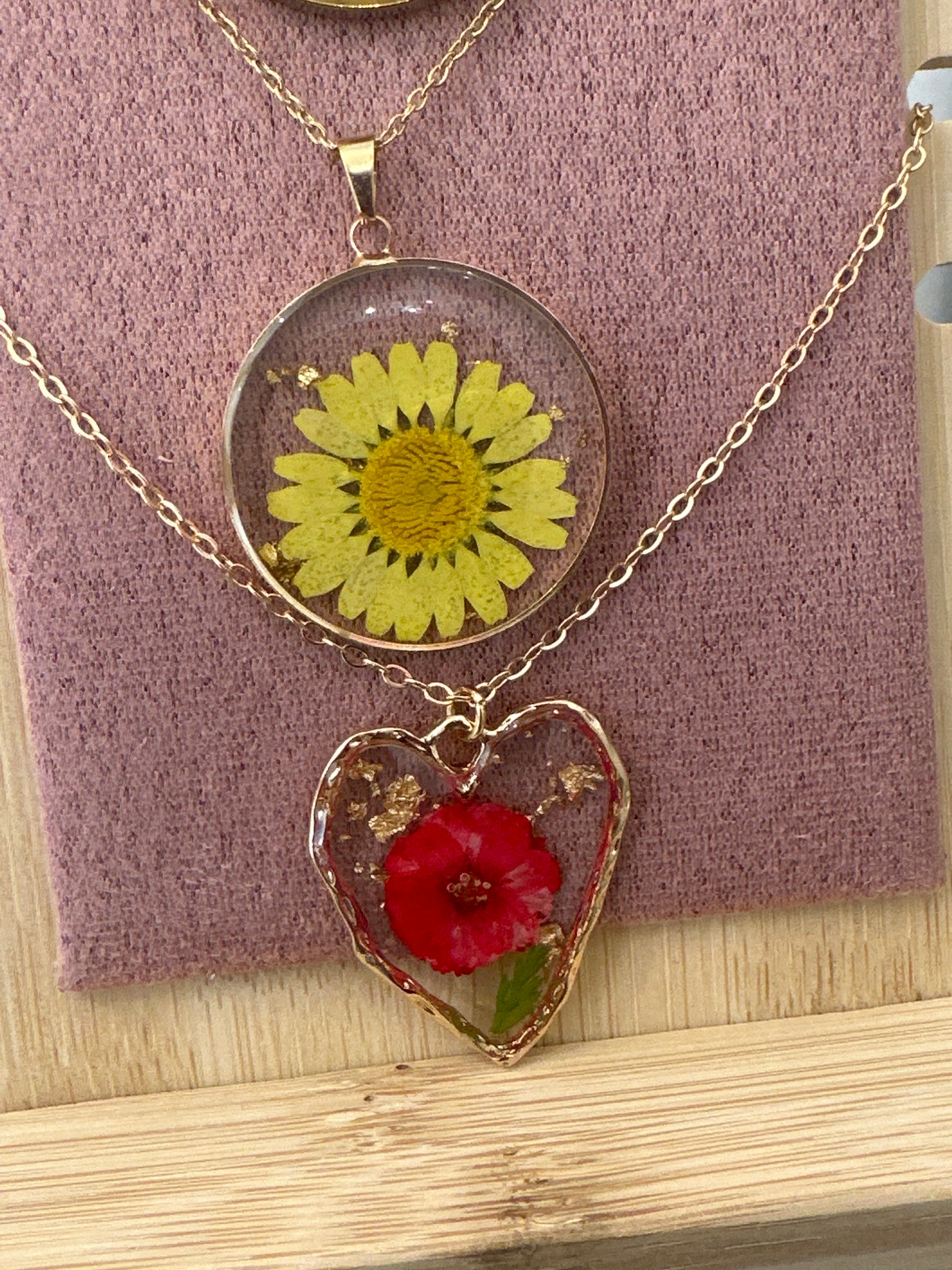 Collana con catenina base gold,regolabile e medaglietta in resina con fiore essicato all’interno.
