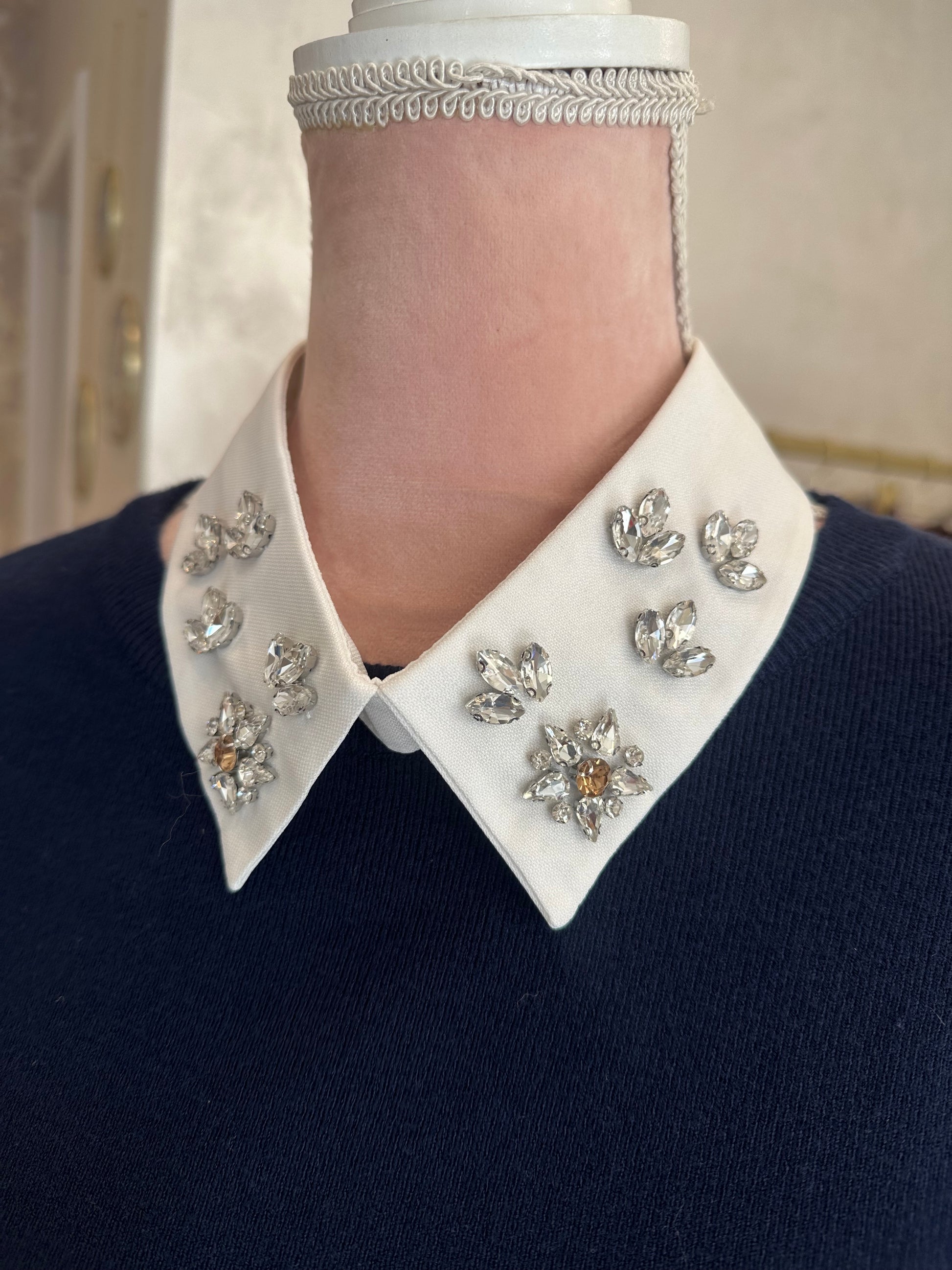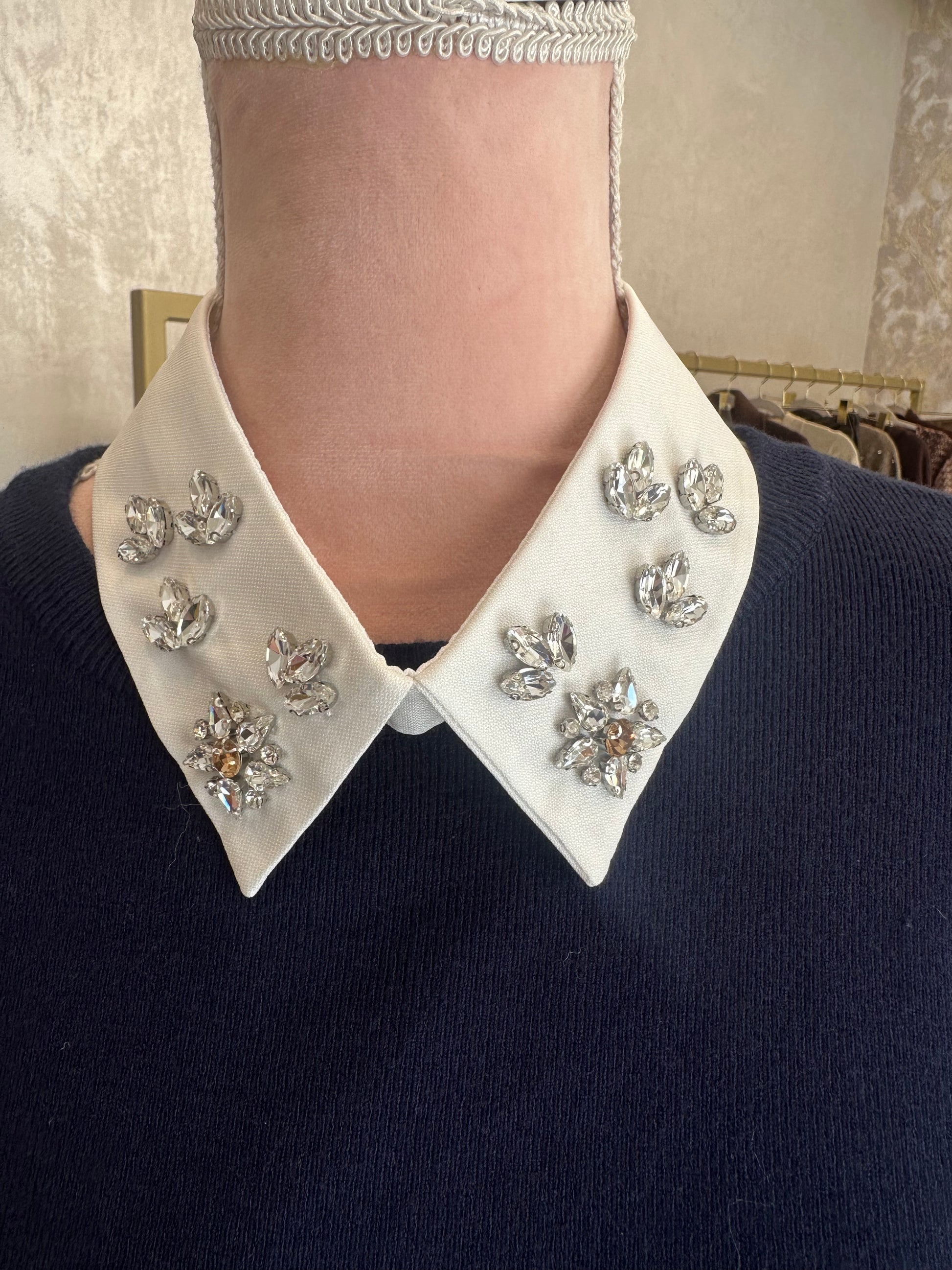 Colletto removibile con bottone sul retro, con applicazioni strass.