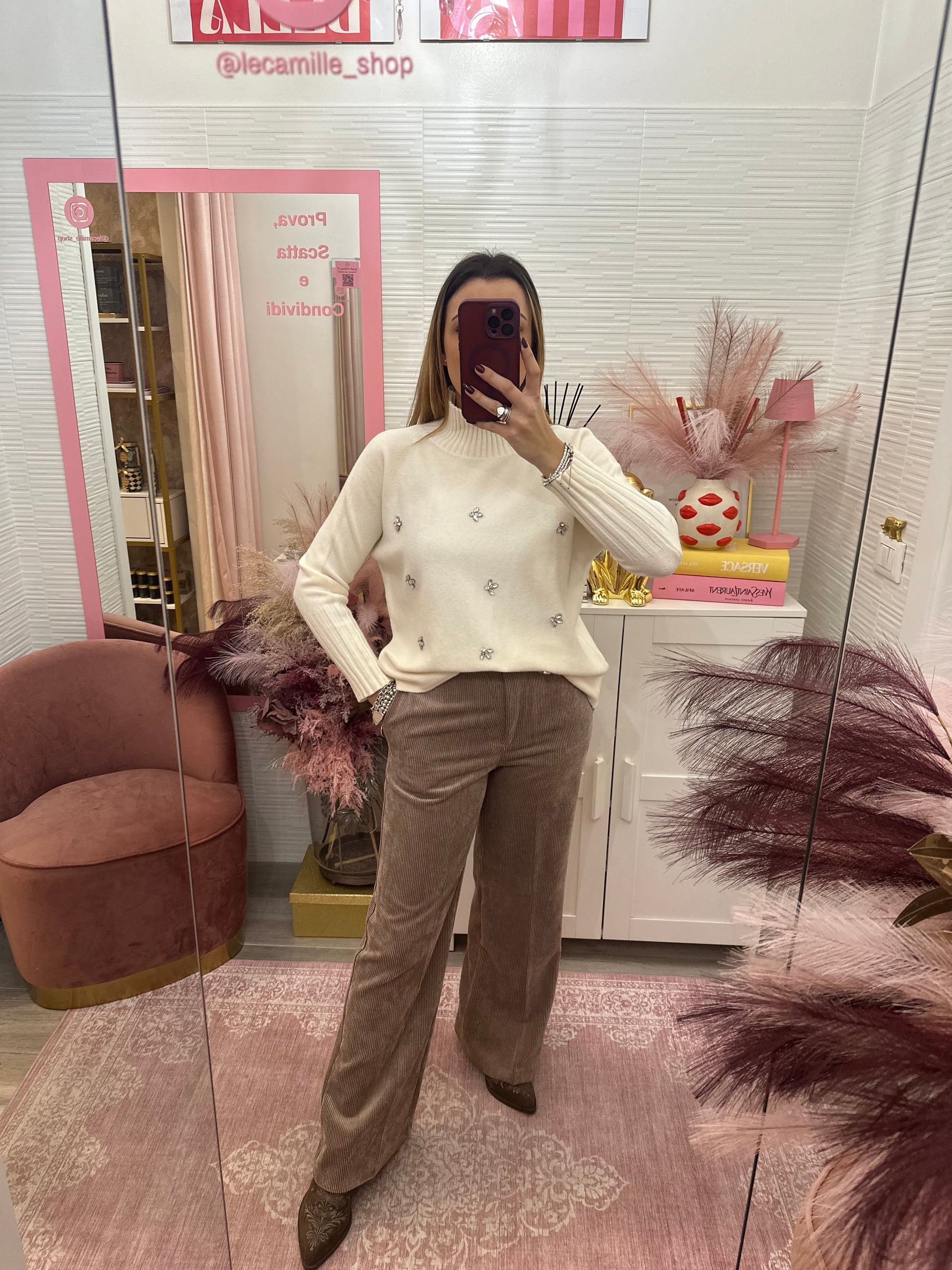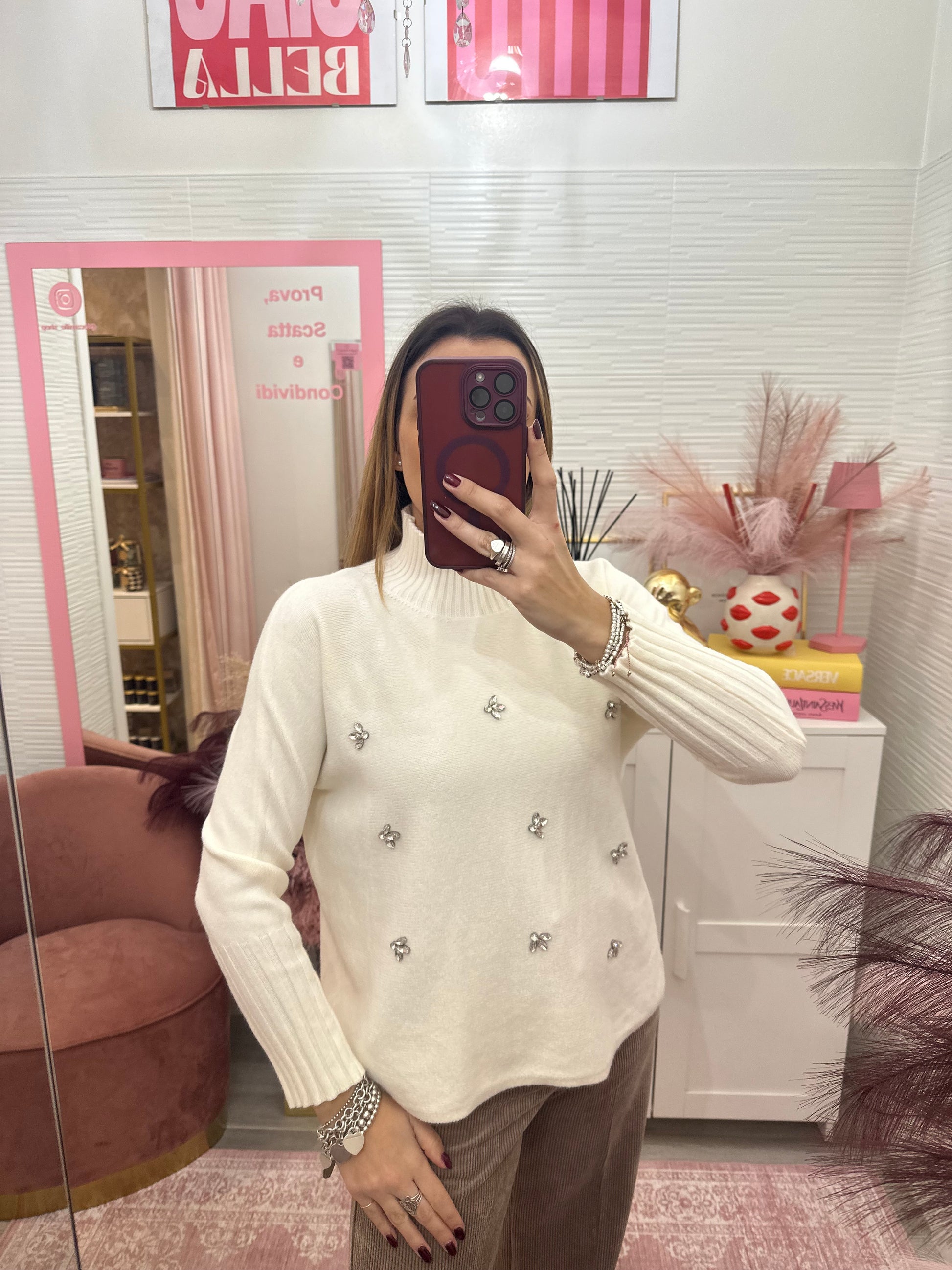 Dolcevita modello morbido, con applicazioni sul davanti.