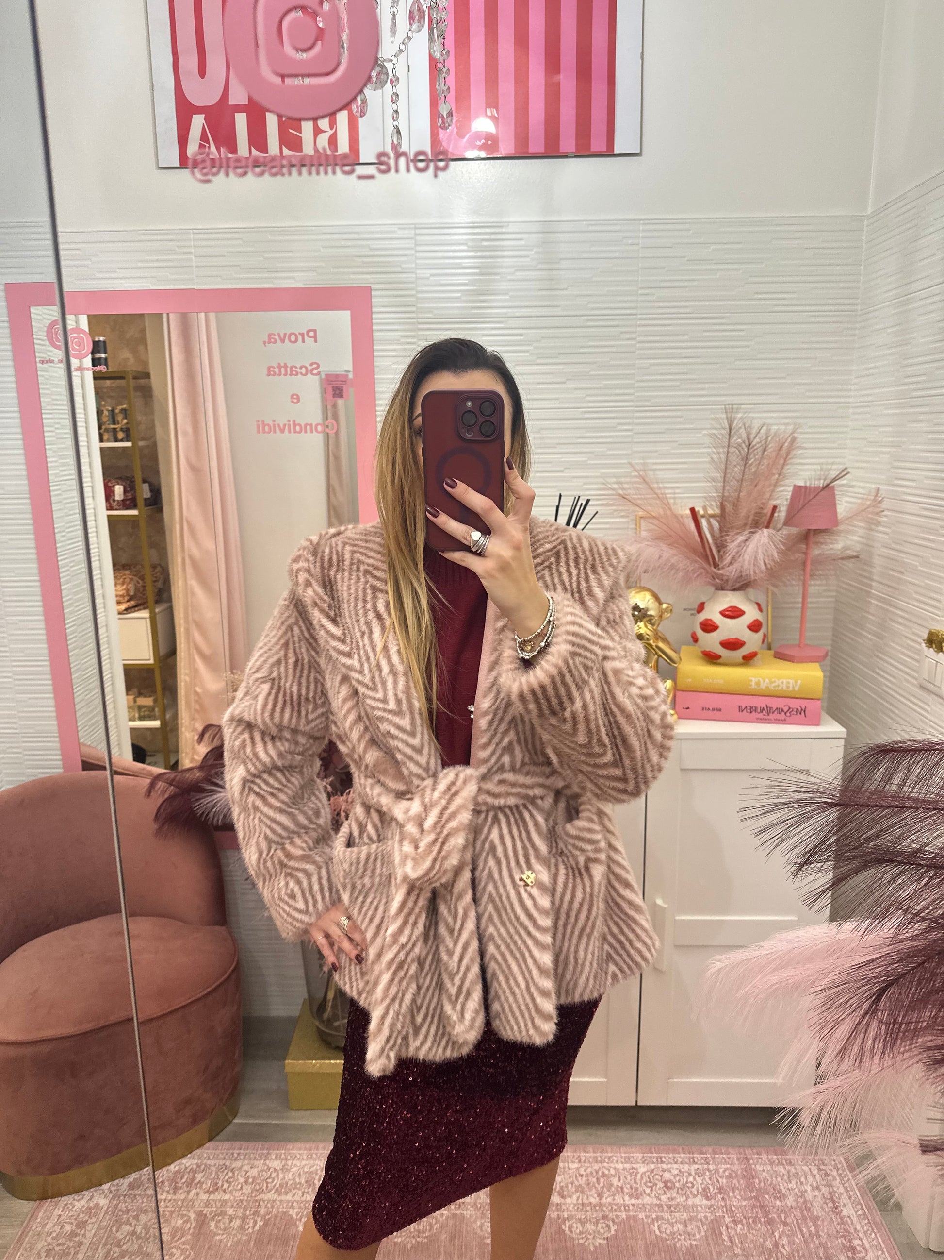 Ecopelliccia con cappuccio e cinturina in vita. Bottoni a scomparsa. Vestibilitá morbida.