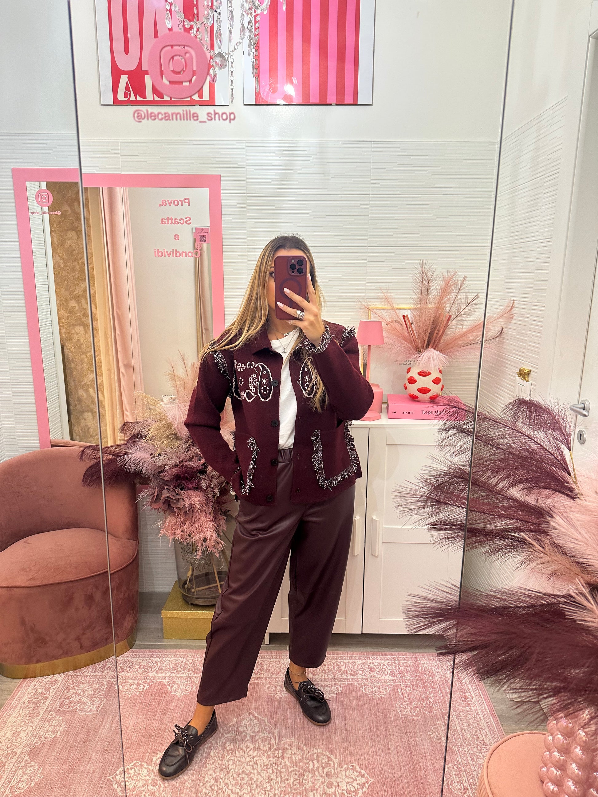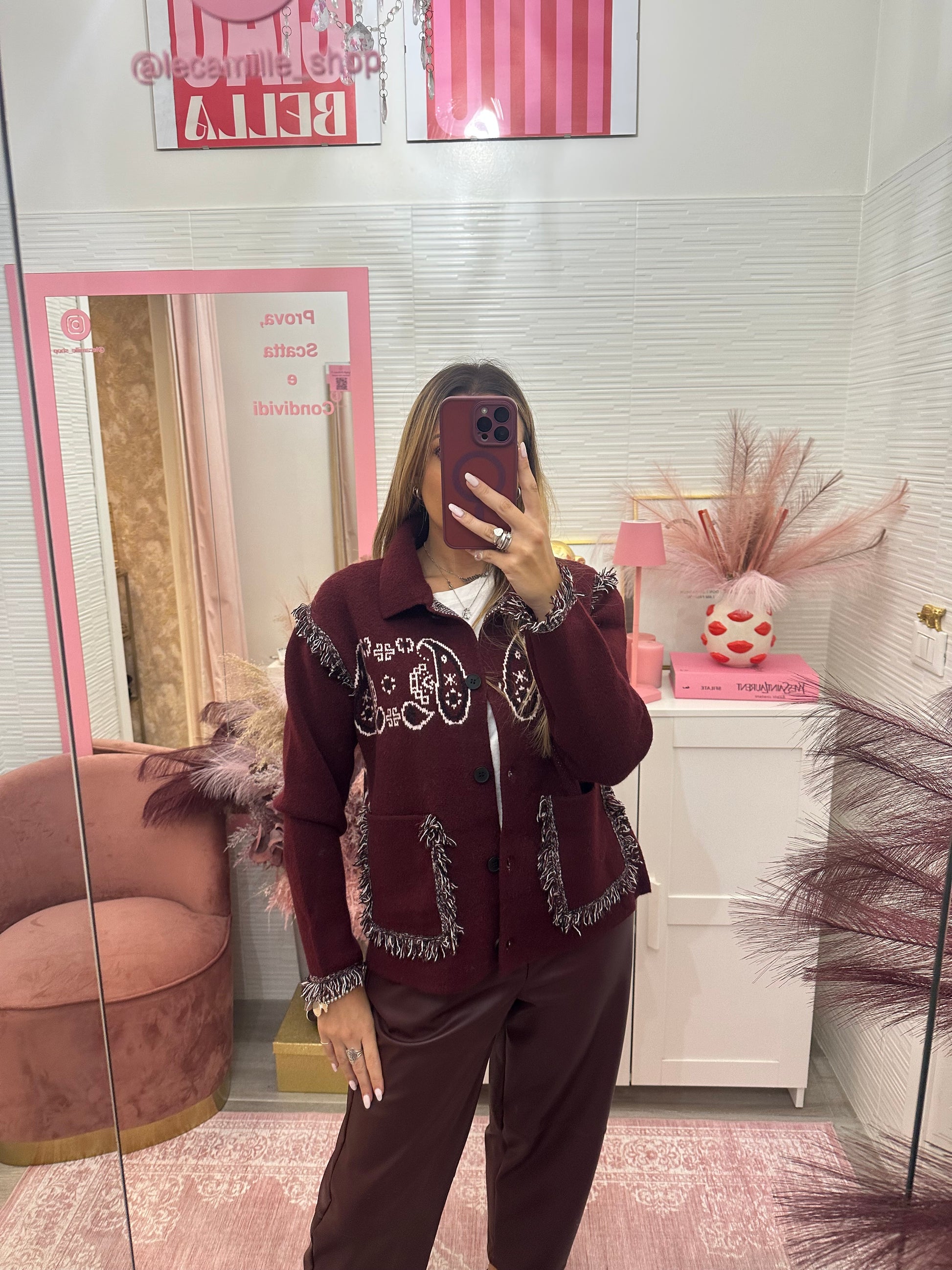 Giacchina/cardigan con dettagli frange e tasche. Vestibilitá morbida. Ideale come attacco di stagione da portare come capo spalla. In inverno come cardigan.