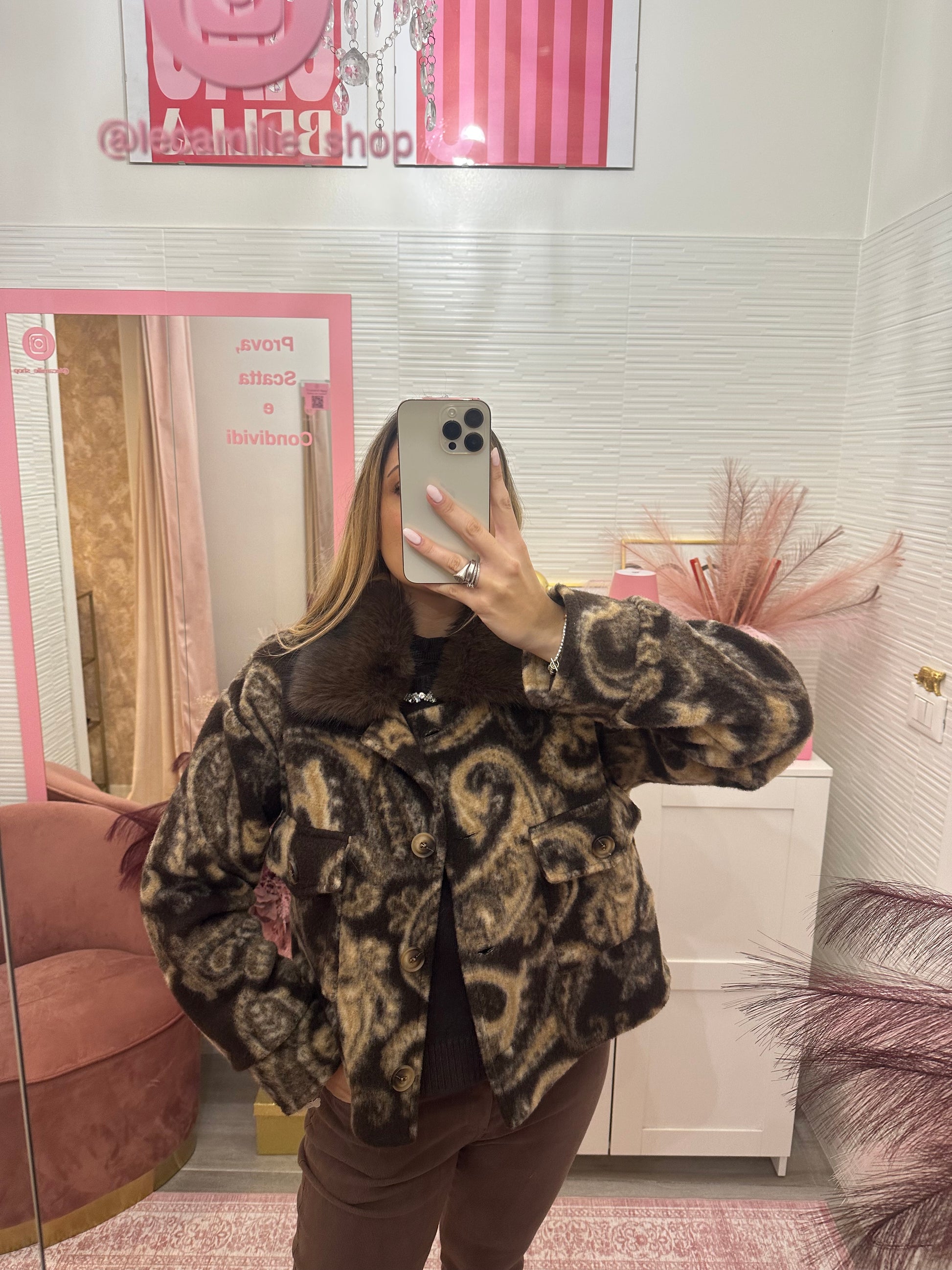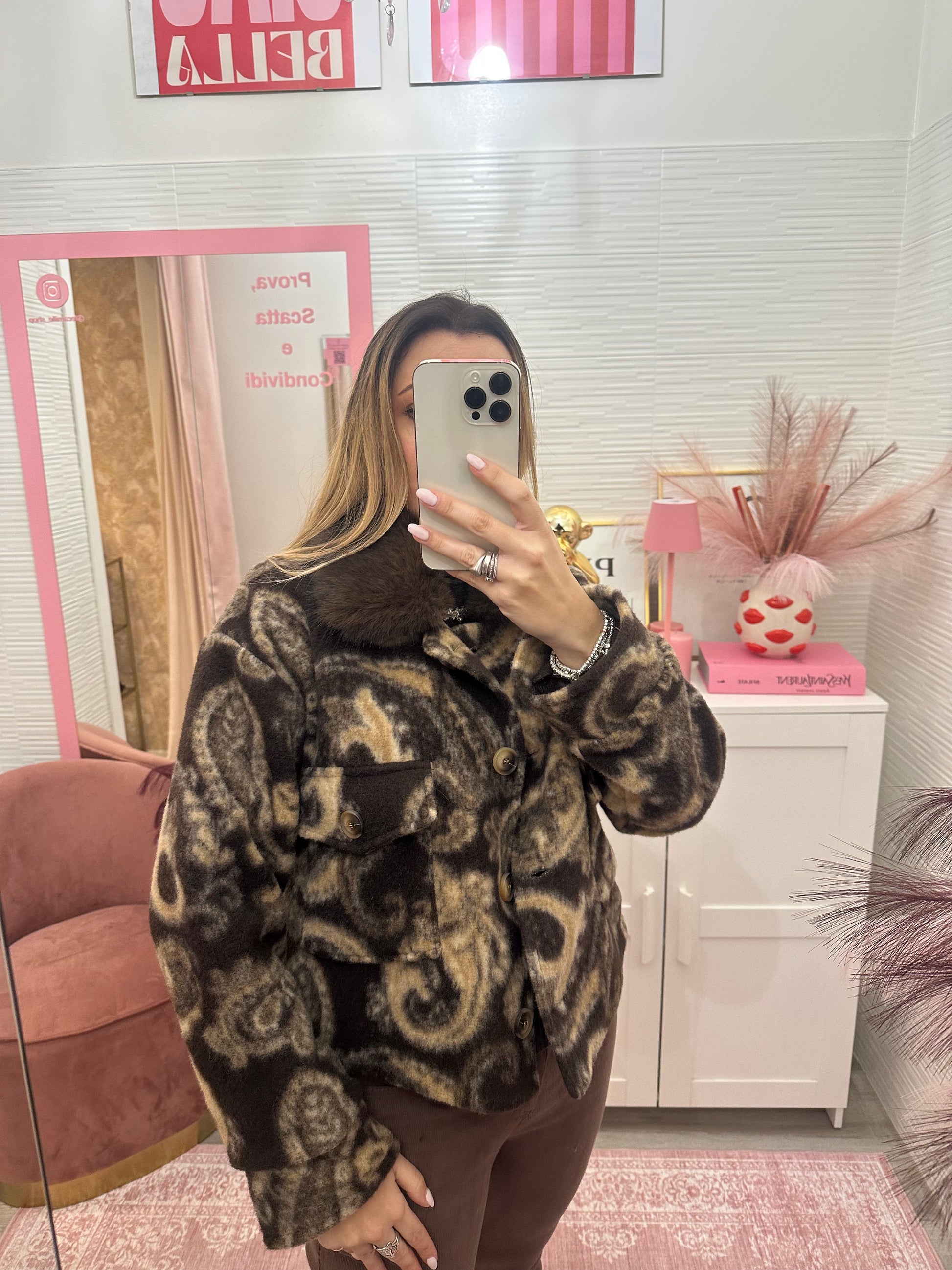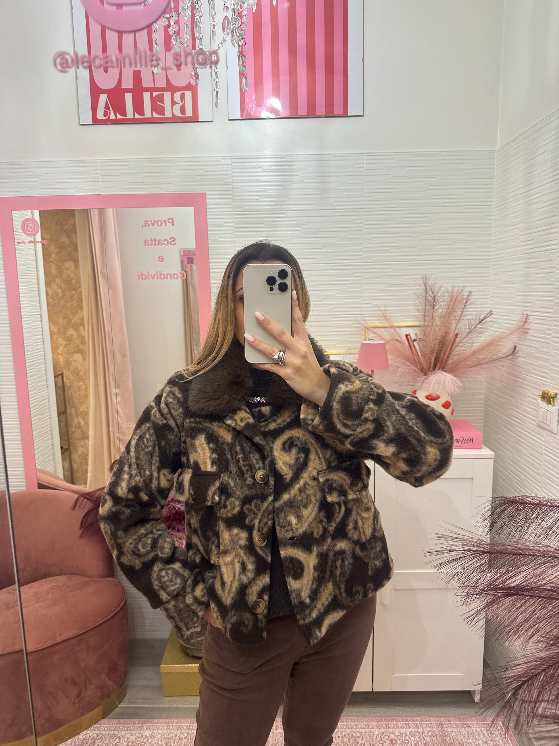 Giacchino corto fantasia pasley bouclè, interno foderato con collo in ecopelliccia. Base marrone.