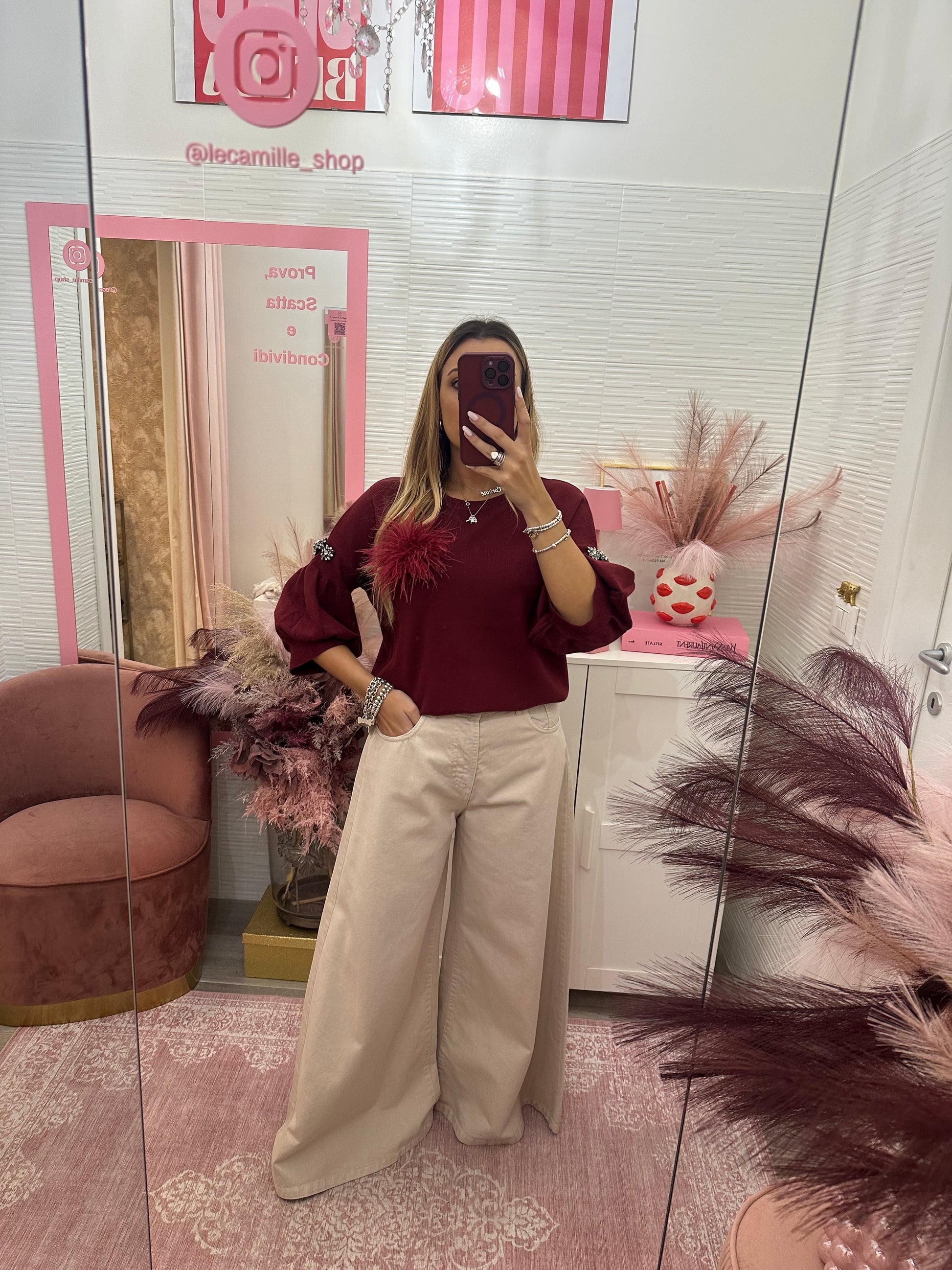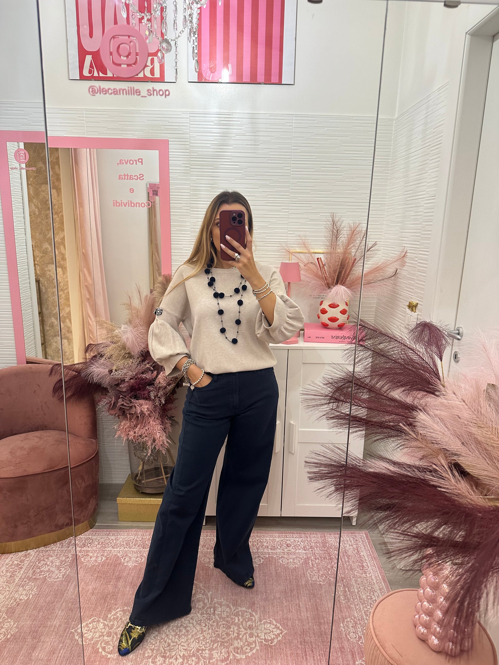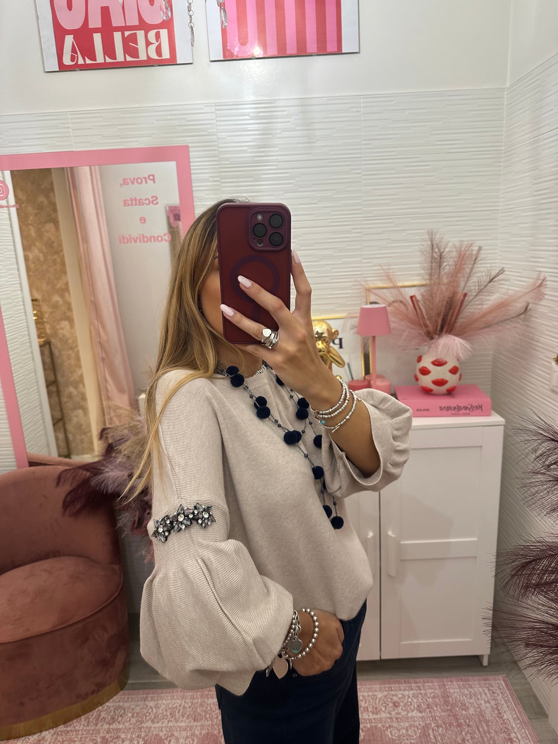 Maglioncino girocollo in maglia di viscosa, manica arrivciata 3/4 con dettaglio strass applicati.