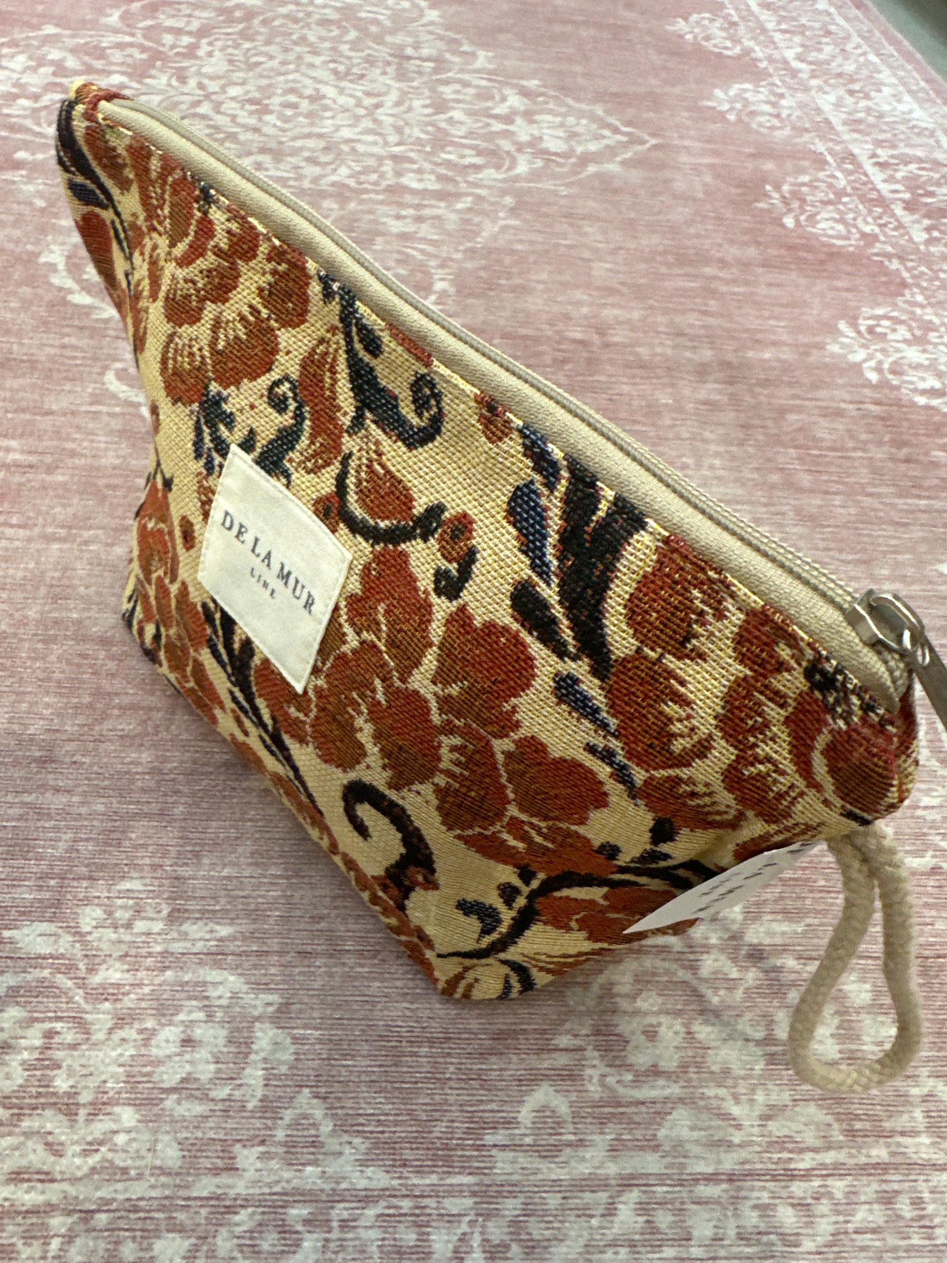 Beauty case con chiusura a zip e manico laterale in cordoncino beige. Realizzato in spesso tessuto jacquard con stampa . Foderato internamente in spesso tessuto grigio. Per una corretta manutenzione, lavare a mano in acqua fredda e non asciugare in asciugatrice.
