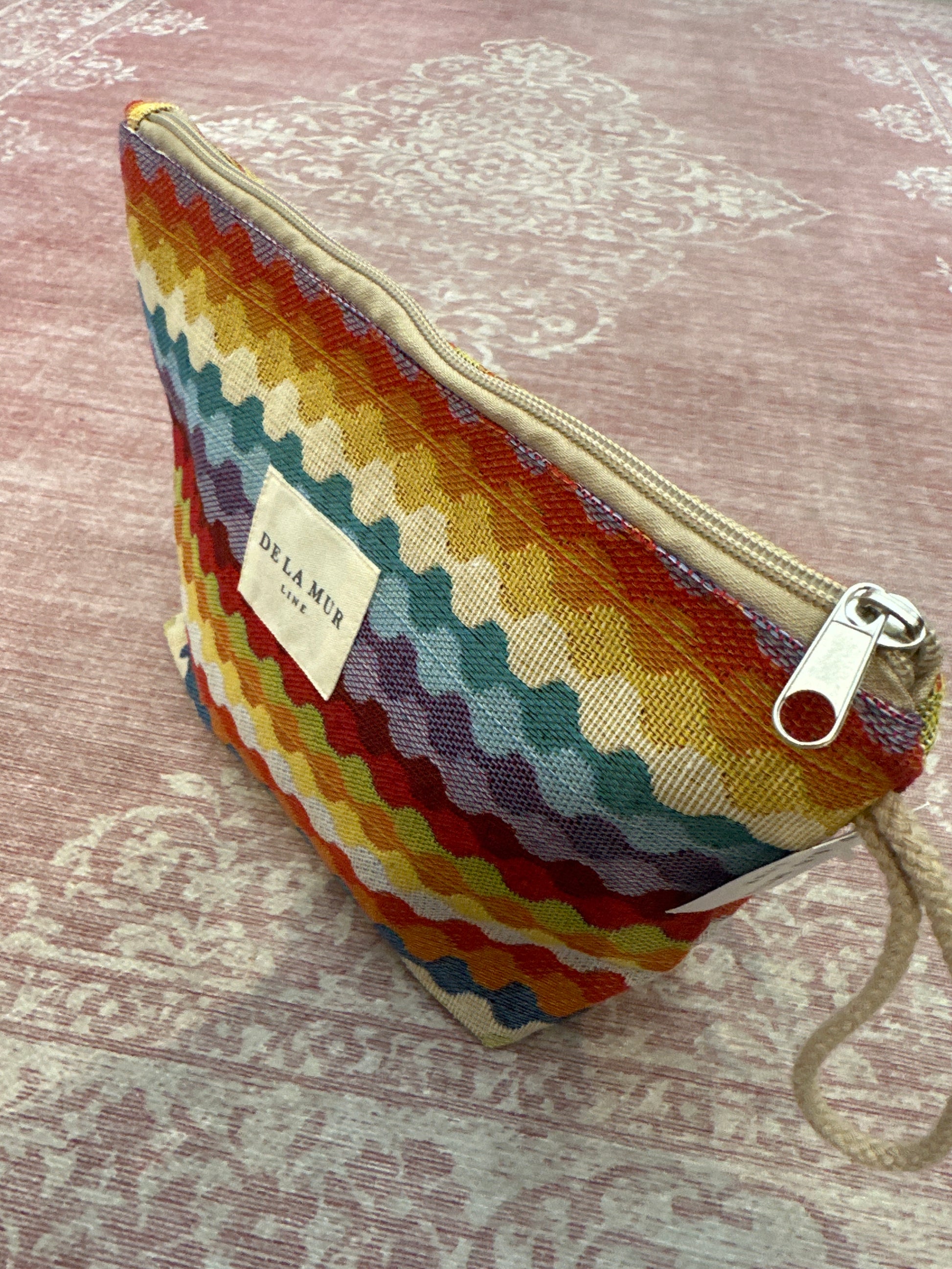 Beauty case con chiusura a zip e manico laterale in cordoncino beige. Realizzato in spesso tessuto jacquard con stampa . Foderato internamente in spesso tessuto grigio. Per una corretta manutenzione, lavare a mano in acqua fredda e non asciugare in asciugatrice.