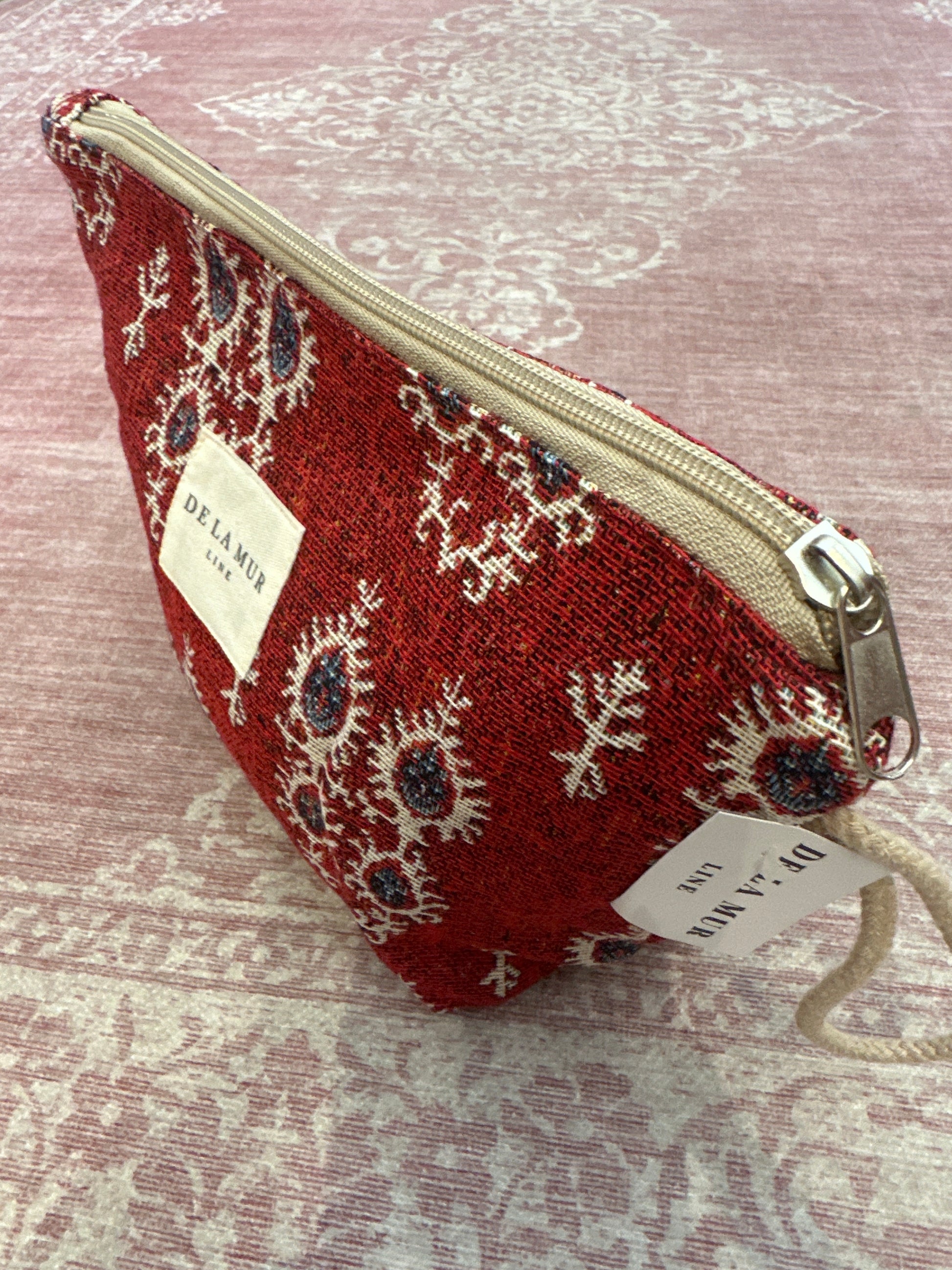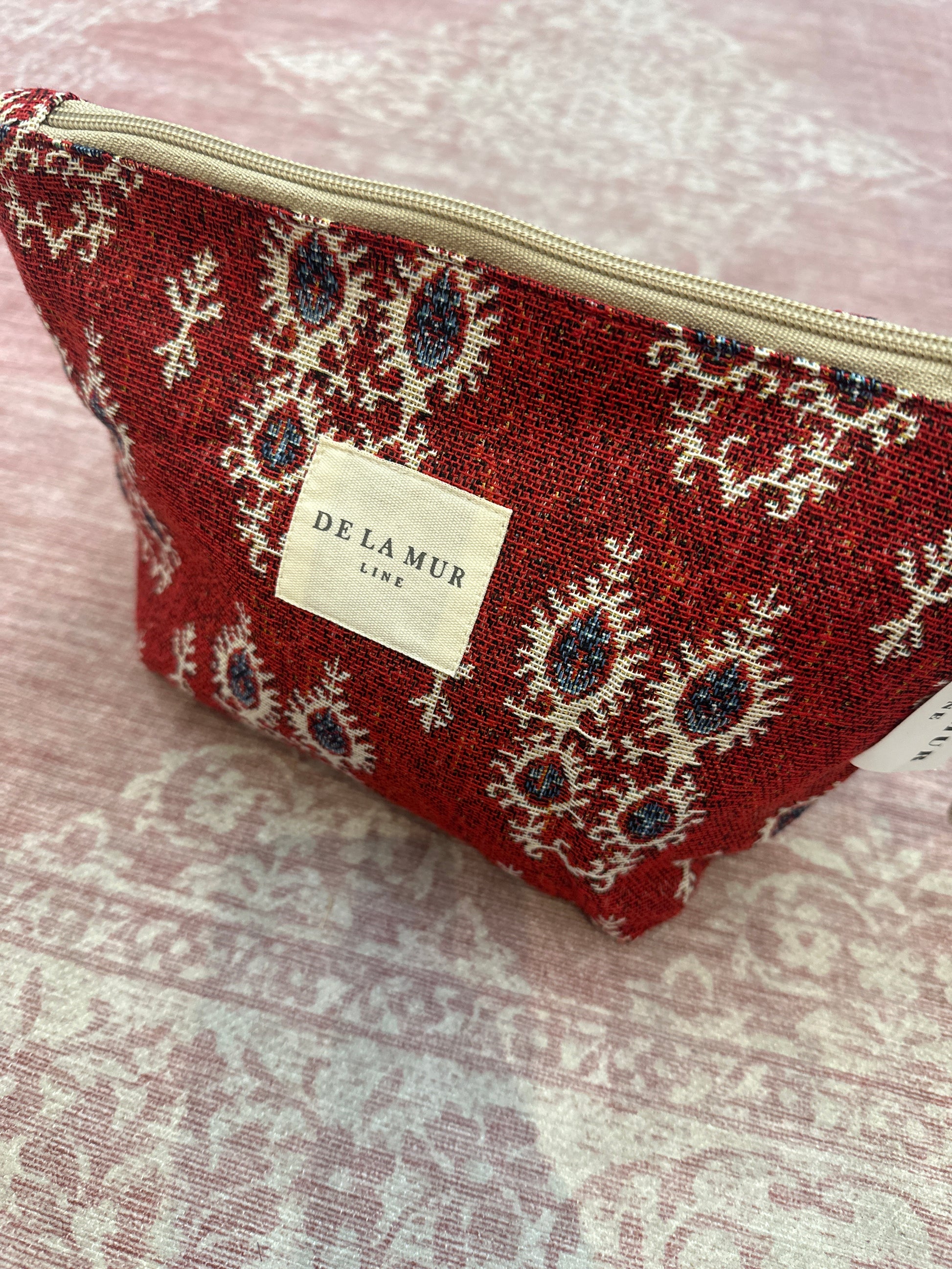 Beauty case con chiusura a zip e manico laterale in cordoncino beige. Realizzato in spesso tessuto jacquard con stampa . Foderato internamente in spesso tessuto grigio. Per una corretta manutenzione, lavare a mano in acqua fredda e non asciugare in asciugatrice.