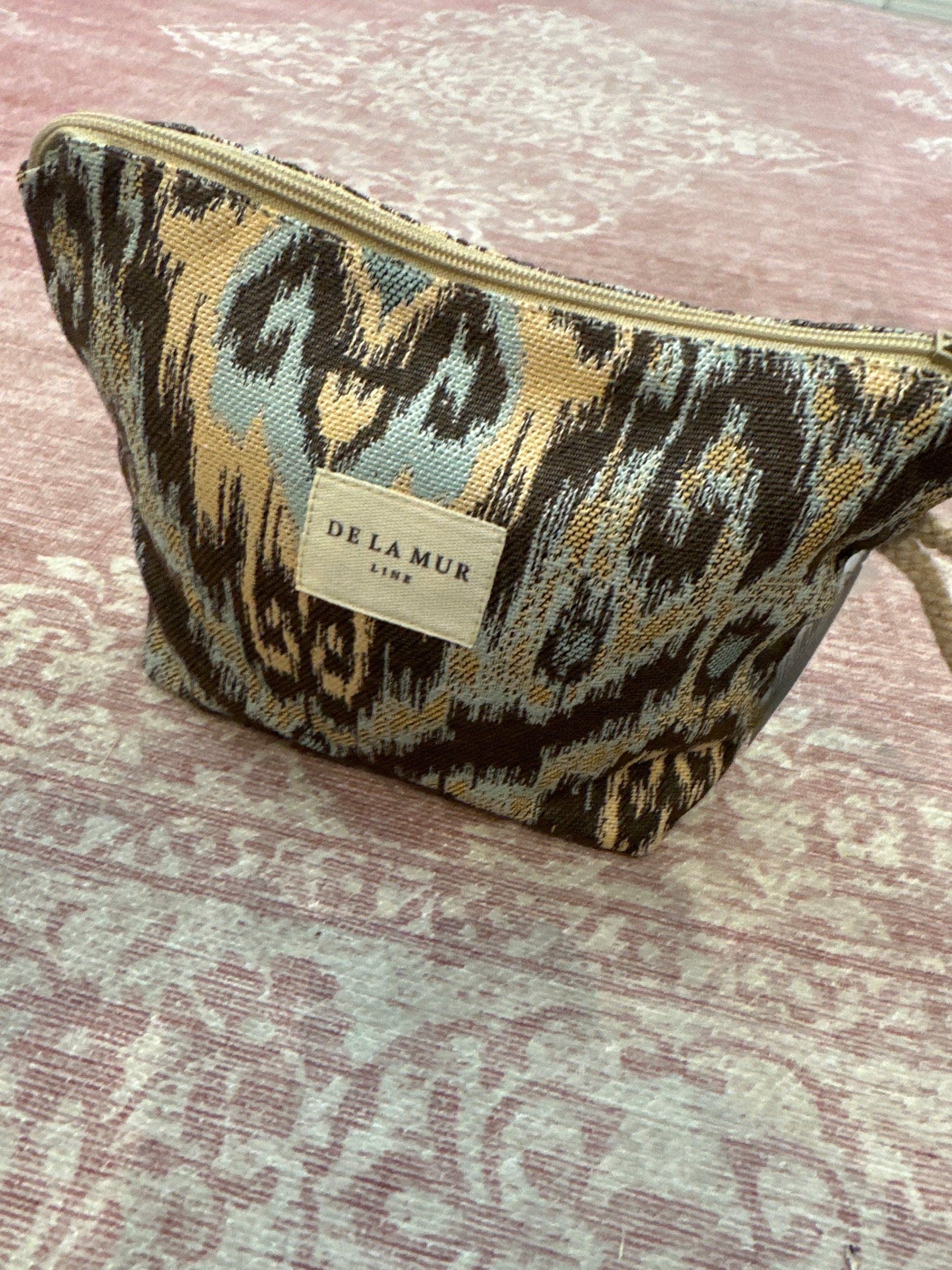 Piccola trousse da toilette con cerniera superiore e manico in corda beige. Realizzata in tessuto jacquard spesso con stampa geometrica . Ogni articolo potrebbe presentare una leggera variazione nella stampa, a seconda del punto in cui è stato tagliato. Per una cura adeguata, si consiglia di lavarlo in acqua fredda e di non asciugarlo in asciugatrice.
