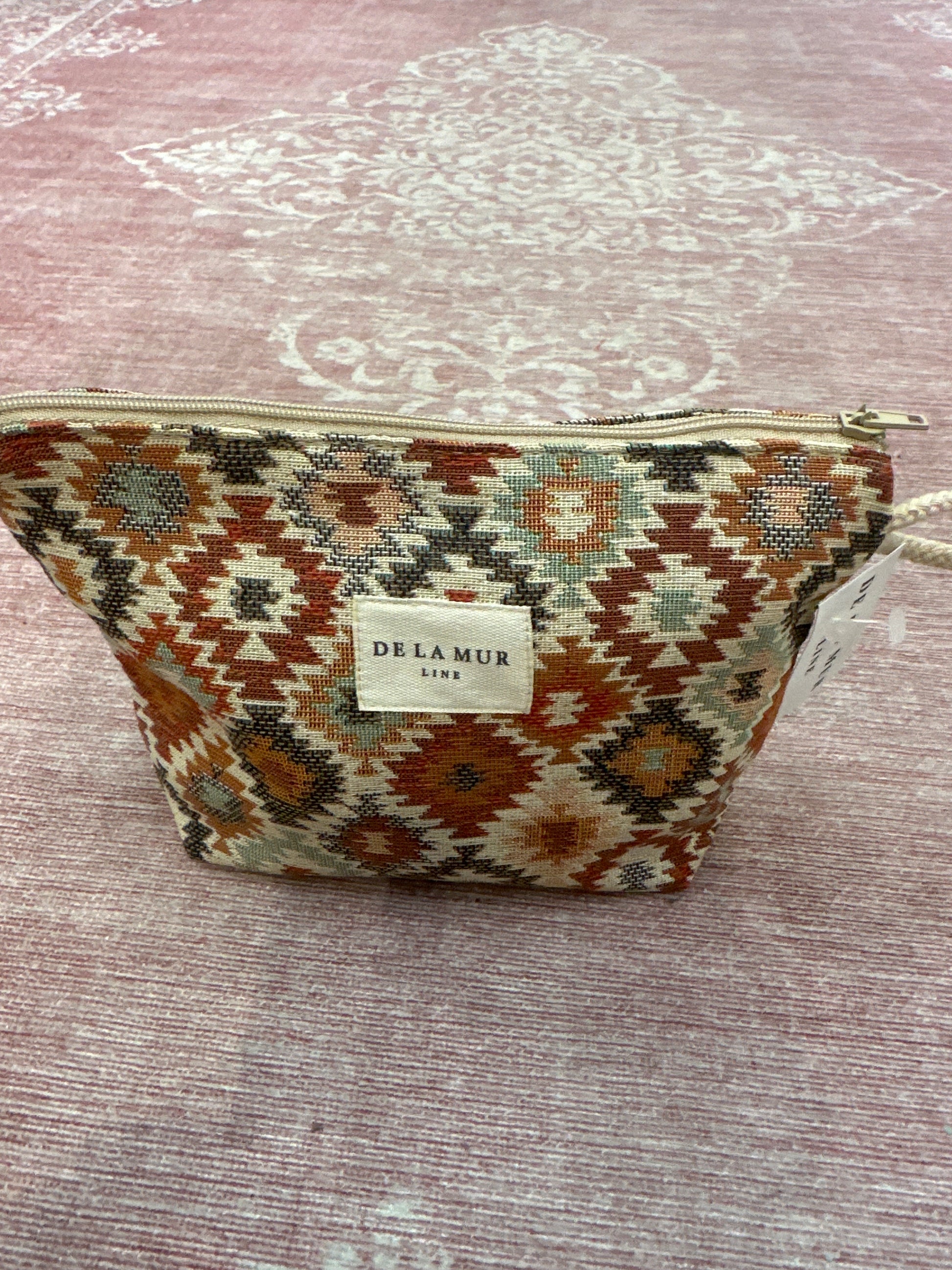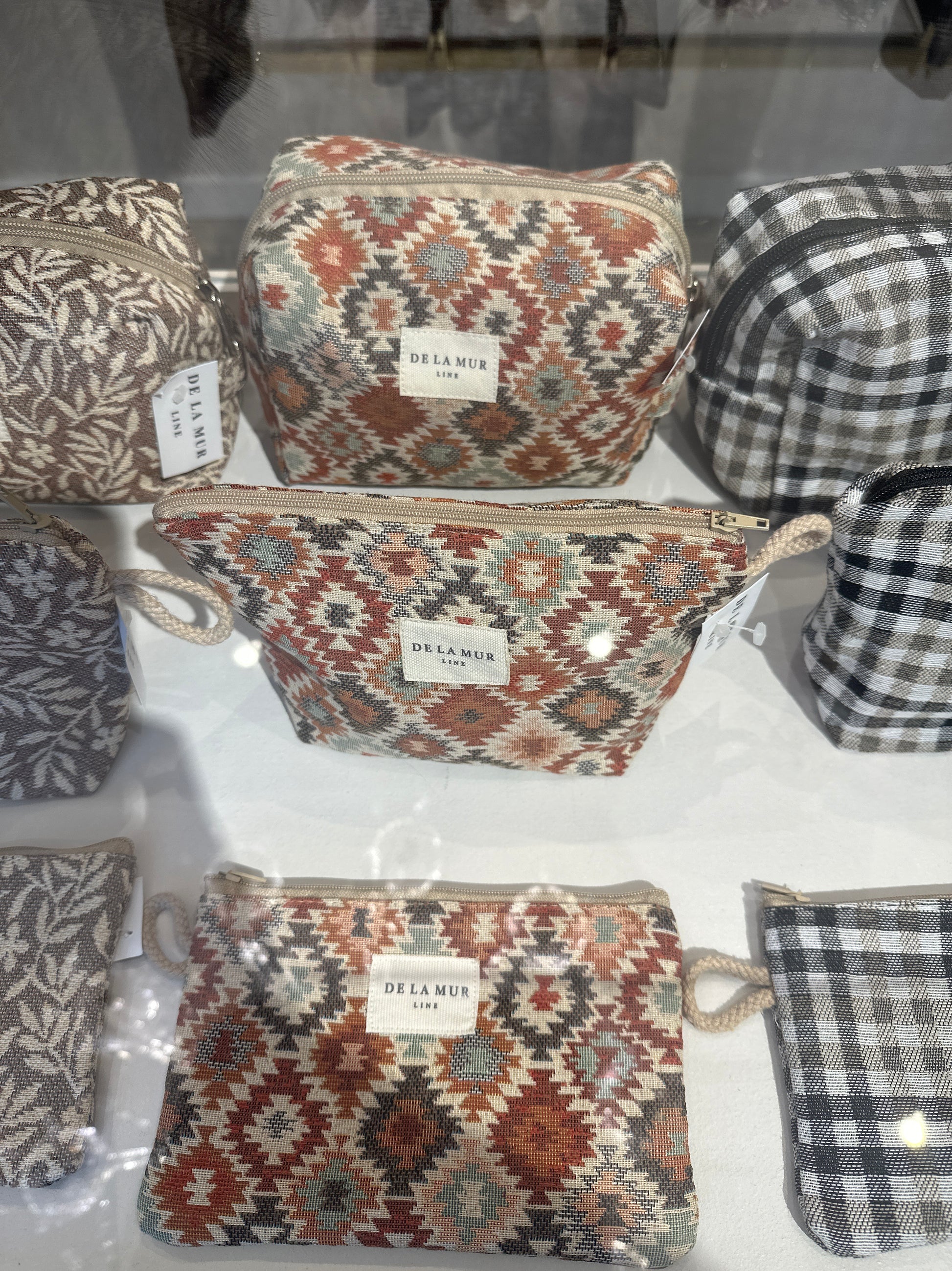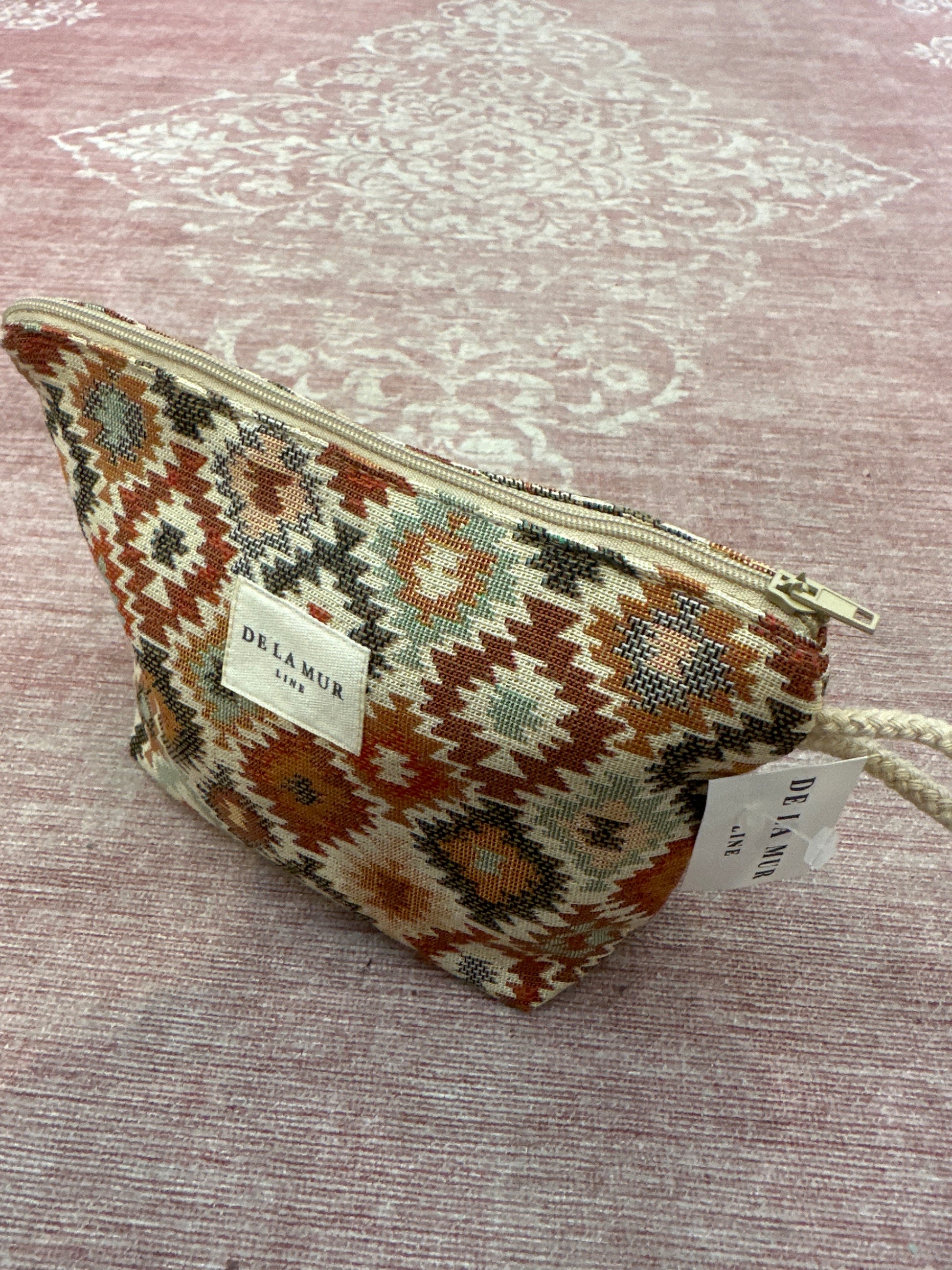 Piccola trousse da toilette con cerniera superiore e manico in corda beige. Realizzata in tessuto jacquard spesso con stampa geometrica . Ogni articolo potrebbe presentare una leggera variazione nella stampa, a seconda del punto in cui è stato tagliato. Per una cura adeguata, si consiglia di lavarlo in acqua fredda e di non asciugarlo in asciugatrice.