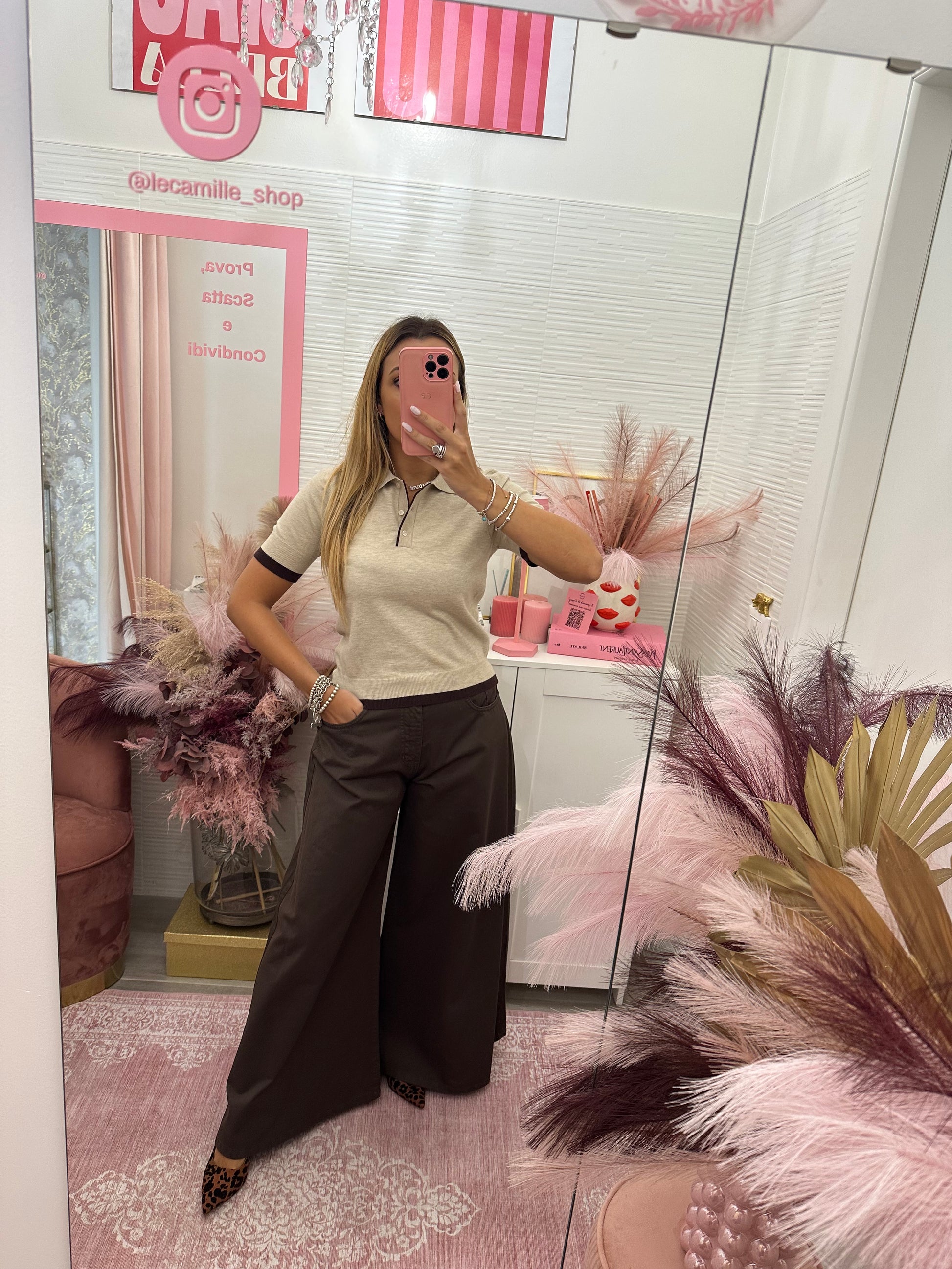 Polo crop in viscosa leggera, con bordini a contrasto. Colletto e 3 bottoni.